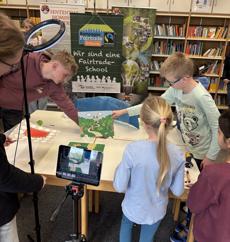 Im Anschluss an das Theaterstück durften die Viertklässler an einem von vier Workshops teilnehmen, die Schülerinnen und Schüler der Oberstufe leiteten. Im Interview-Workshop wurde geübt, wie man vor laufender Kamera ins Mikrofon spricht und Fragen beantwortet. In zwei weiteren Workshops wurden Standbildreisen erstellt. Hier durften sich die Kinder Requisiten anziehen, sich dafür schminken und Szenenbilder erfinden, die jeweils fotografiert wurden. Beim Workshop Stop-Motion-Film wurde mit Playmobil-Figuren gearbeitet. Die Figuren wurden immer wieder neu platziert und fotografiert, so dass am Ende eine zusammenhängende Geschichte herauskam.